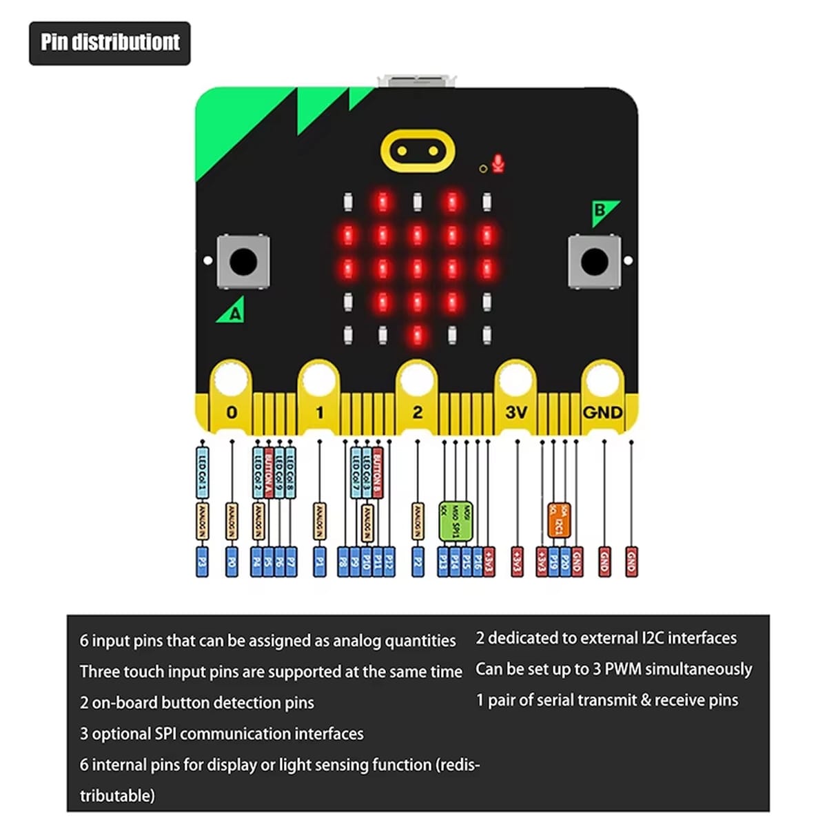 A panel 25 pontos élcsatlakozóval rendelkezik. A 0, 1 és 2 lábak GPIO és ADC funkcióra is használhatók, a 3V és GND pontok pedig a tápellátást segítik. A v2-es változatnál a 0, 1, 2 láb és a LOGO kapacitív érintésként is működhet, így bizonyos projektekhez még külön nyomógomb sem szükséges.