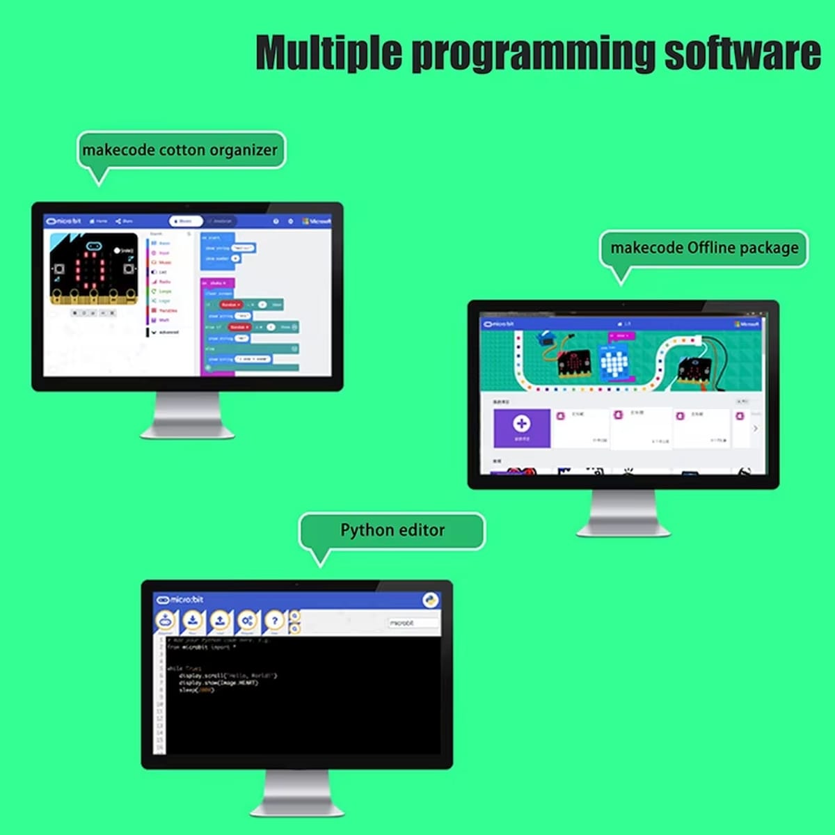 - Fejlesztőkörnyezetek: MakeCode Blocks, MakeCode JavaScript, Python Editor, MicroPython, Arduino IDE