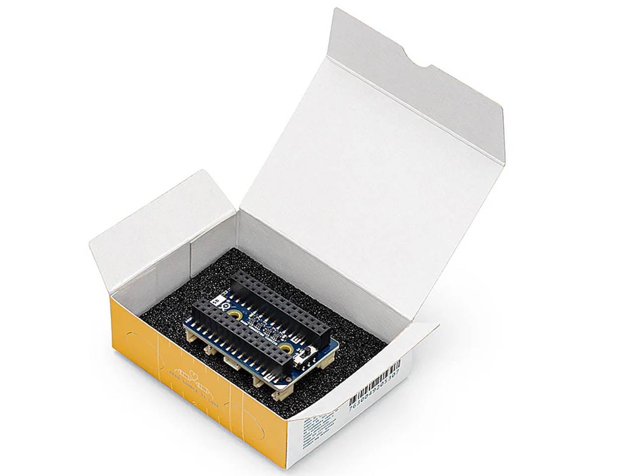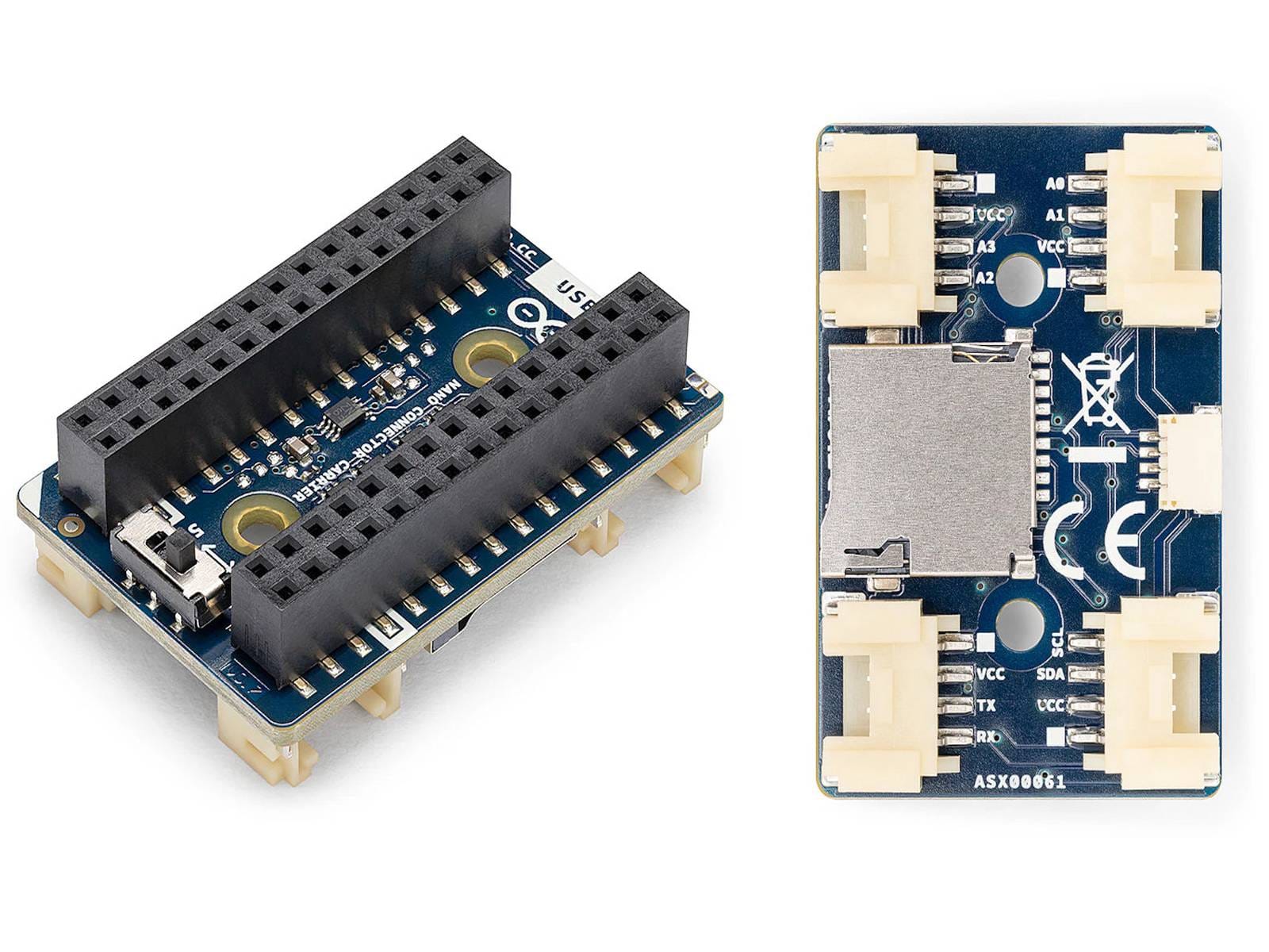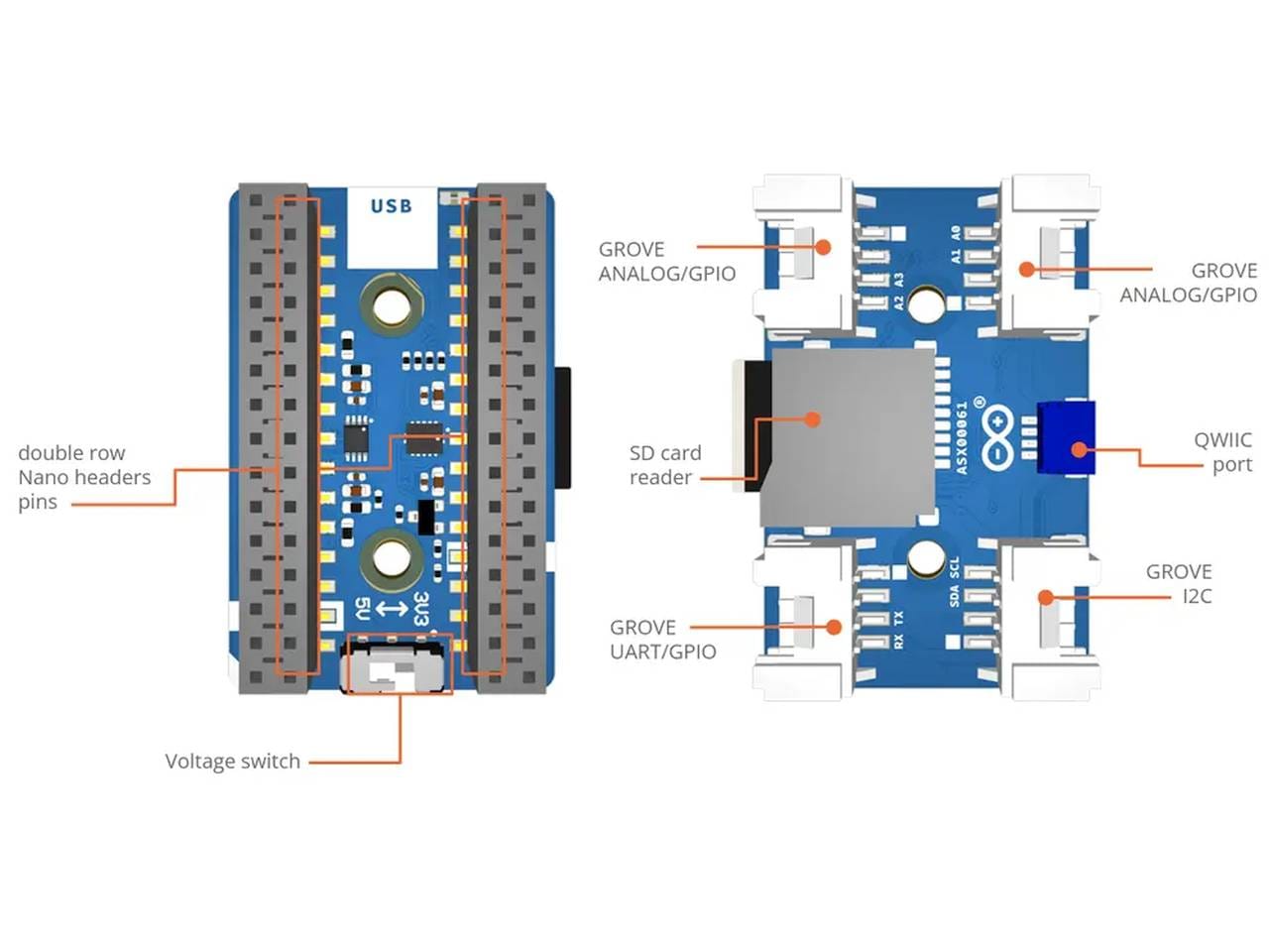 A hordozótábla Arduino Nano formátumú fejlesztőlapokra illeszkedik, és a csatlakoztatott modulok azonnal használatba vehetők a beépített Grove, Qwiic és microSD interfészeken keresztül. A Grove rendszer az analóg/digitális, UART és I²C eszközök csatlakoztatását támogatja, míg a Qwiic csatlakozó I²C alapú modulokhoz kínál gyors csatlakozást. A microSD kártyaolvasó SPI-n keresztül kommunikál, lehetővé téve az adatok naplózását vagy edge AI modellek lokális betöltését.