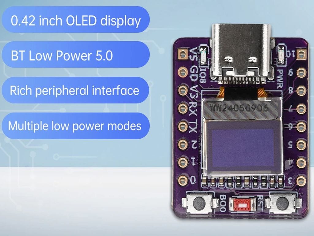 A beépített 0,42″ OLED kijelző tipikusan 72×40 pixeles felbontású, amely egyszerű szöveges és grafikus megjelenítésekre, piktogramokra, menükre és mérési adatok kijelzésére ideális. A kijelző jellemzően I²C interfésszel kapcsolódik a mikrokontrollerhez.