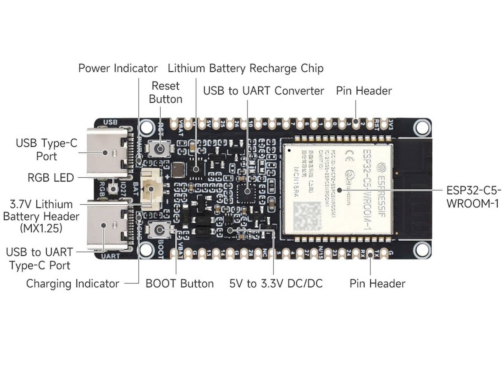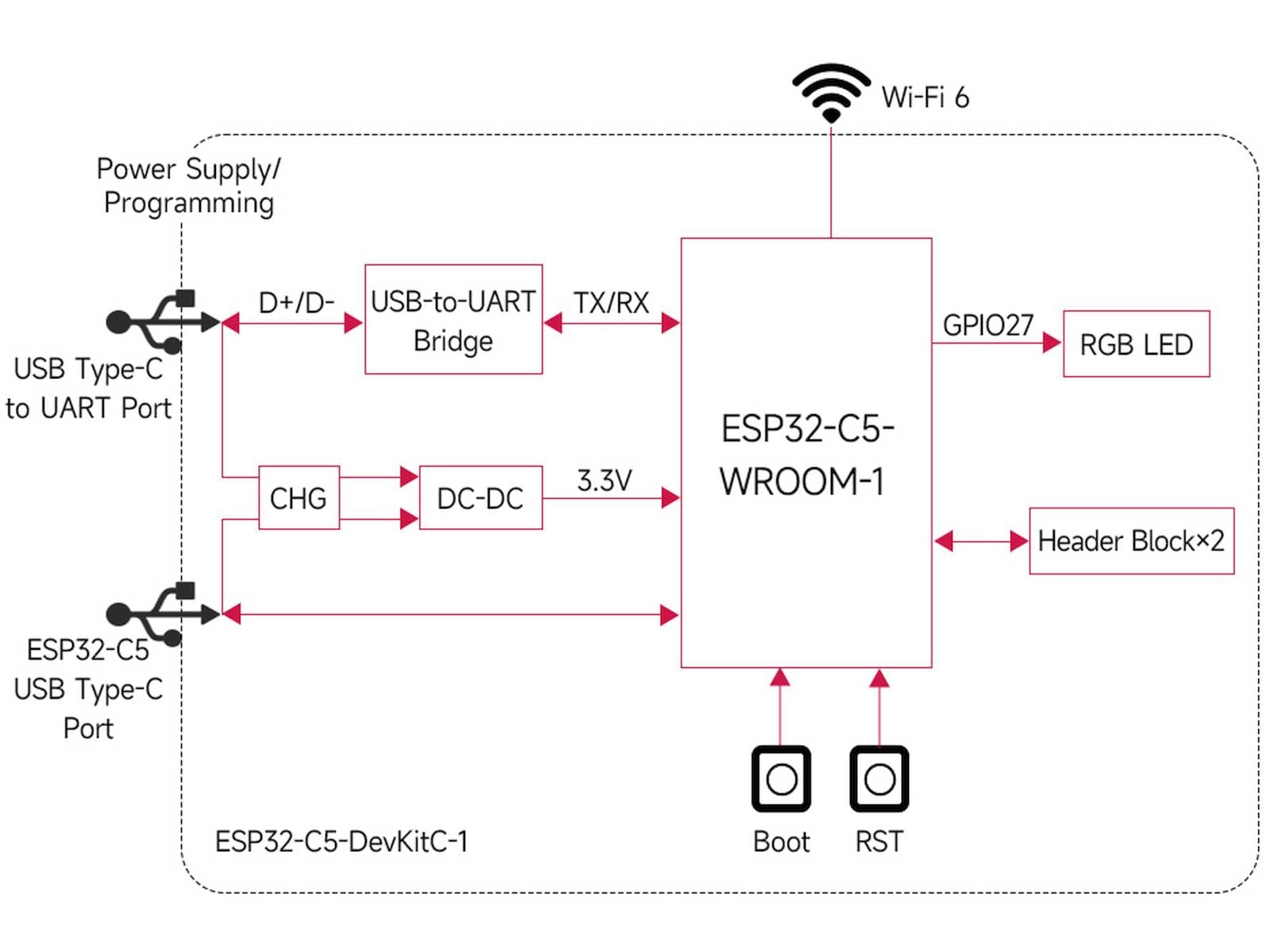 Az ESP32-C5 WiFi 6 fejlesztőpanel olyan mikrokontrolleres alappanel, amely 2,4 GHz és 5 GHz hálózaton is képes működni, és BLE valamint Zigbee rádiót is biztosít. A 16 MB Flash és 8 MB PSRAM memóriával szerelt ESP32-C5 fejlesztőpanel nagyobb firmware mérethez és hálózati puffereléshez ad tervezési tartalékot.