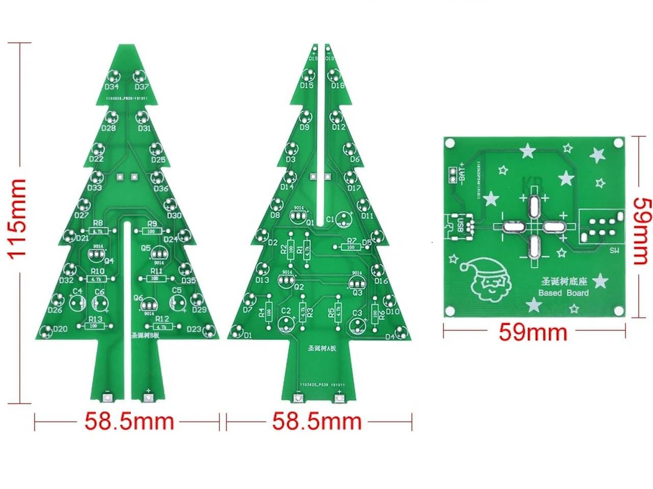 A KIT három különálló PCB‑ből áll: CTR‑30A, CTR‑30B és CTR‑30C típusú lapok, melyeken összesen 36–37 LED villog egymástól függetlenül, fázisban váltakozva. A villogást RC-oszcillátorok (ellenállás és kondenzátor lánc) generálják, S9014 tranzisztorok vezérlik a LED‑csoportokat, így látszólag véletlenszerű, mégis szinkronizált fényjáték jön létre. A zöld LED‑ekhez alacsonyabb ellenállást (pl. 330 Ω) használ a gyártó, hogy ellensúlyozza a zöld szín általában gyengébb fényerejét. A PCB 1,6 mm vastag, tartós és a komponenselrendezés jól olvasható. A tápellátás DC 4,5–5 V (USB vagy AA elem) szükséges – részletek a FAQ-ban találhatók.