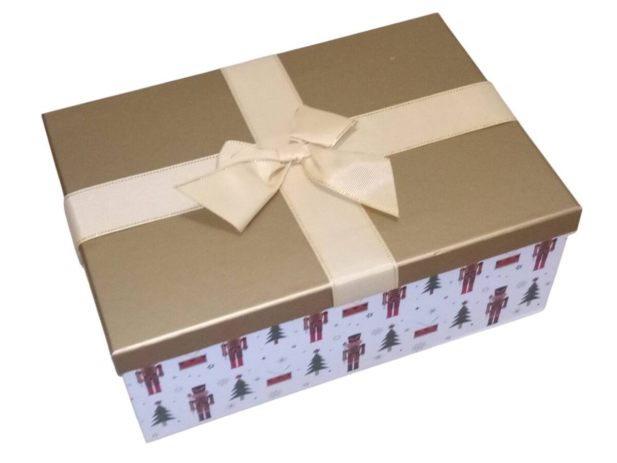 Ez a magasított karácsonyi kivitelű ajándékdoboz kimondottan azok számára készült, akik saját kézzel összeállított technológiai meglepetést szeretnének igényes formában átadni. A doboz alsó részét ünnepi mintázat – diótörő figura, fenyő, hópehely – díszíti, míg a felsőrész elegáns aranyszínű tető, melyet krém színű textilmasni egészít ki.