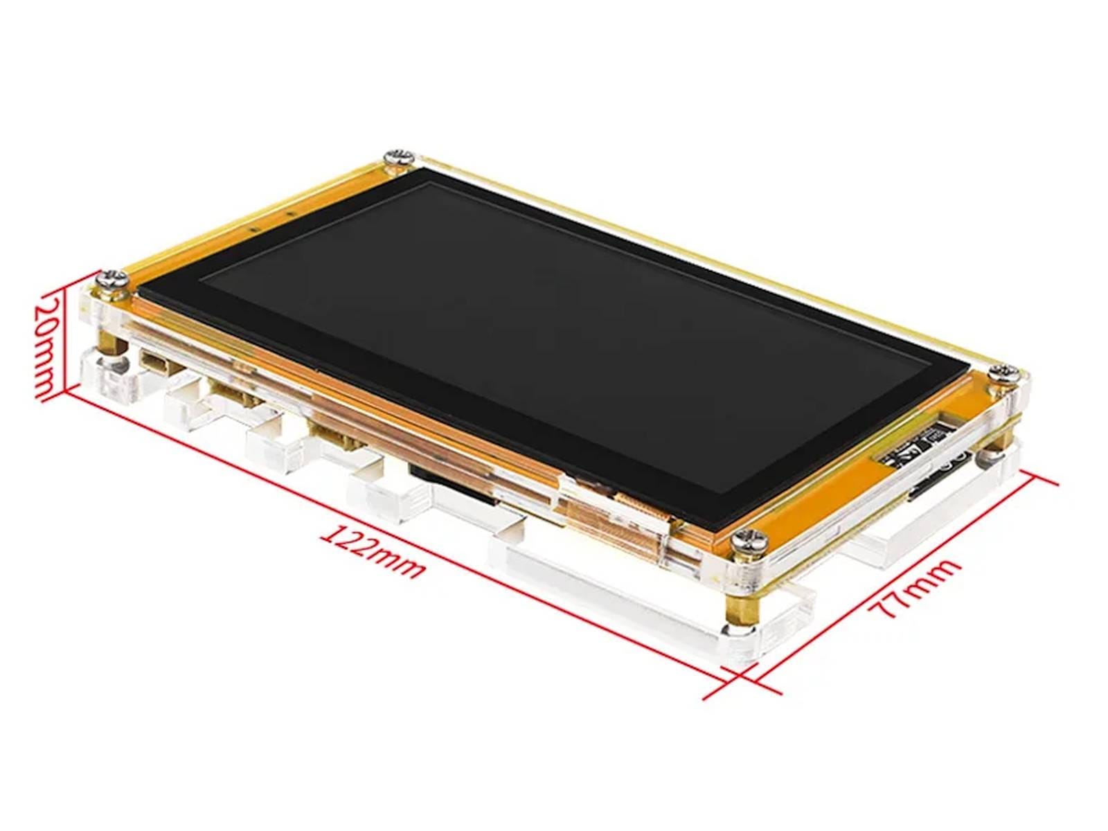 Ez az akrilház (plexi tok) kifejezetten az ESP32‑S3 alapú, 4,3 hüvelykes, 800×480 felbontású kijelzős fejlesztőpanelhez készült. Olyan projektekhez ideális, ahol szükség van védelmére, elegáns megjelenésre és fizikai rögzítésre a kijelző és az elektronika számára. Fő előnyei: