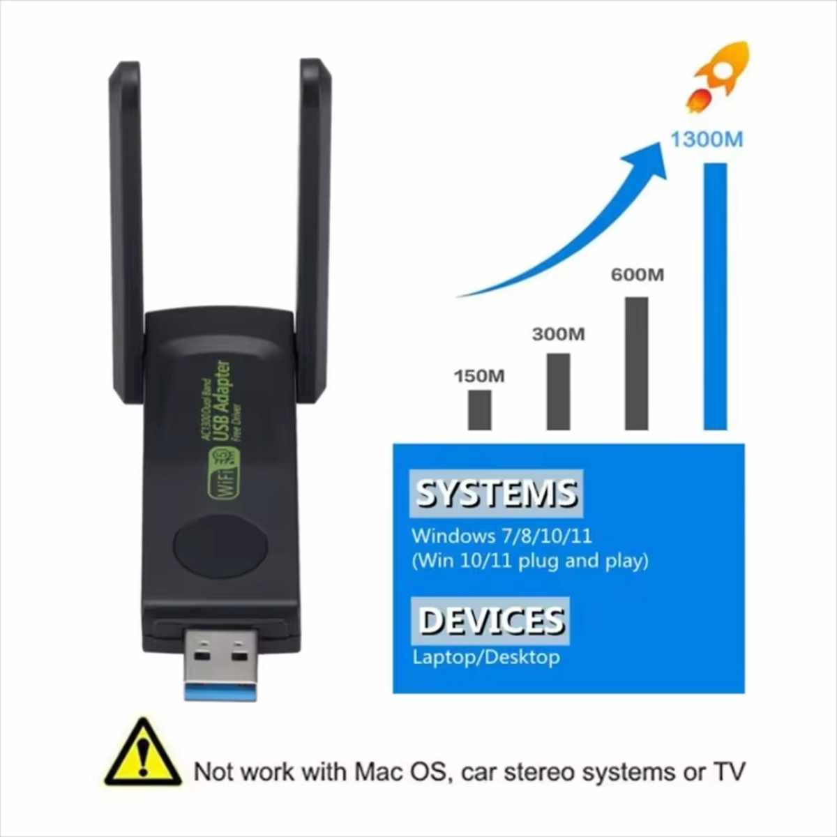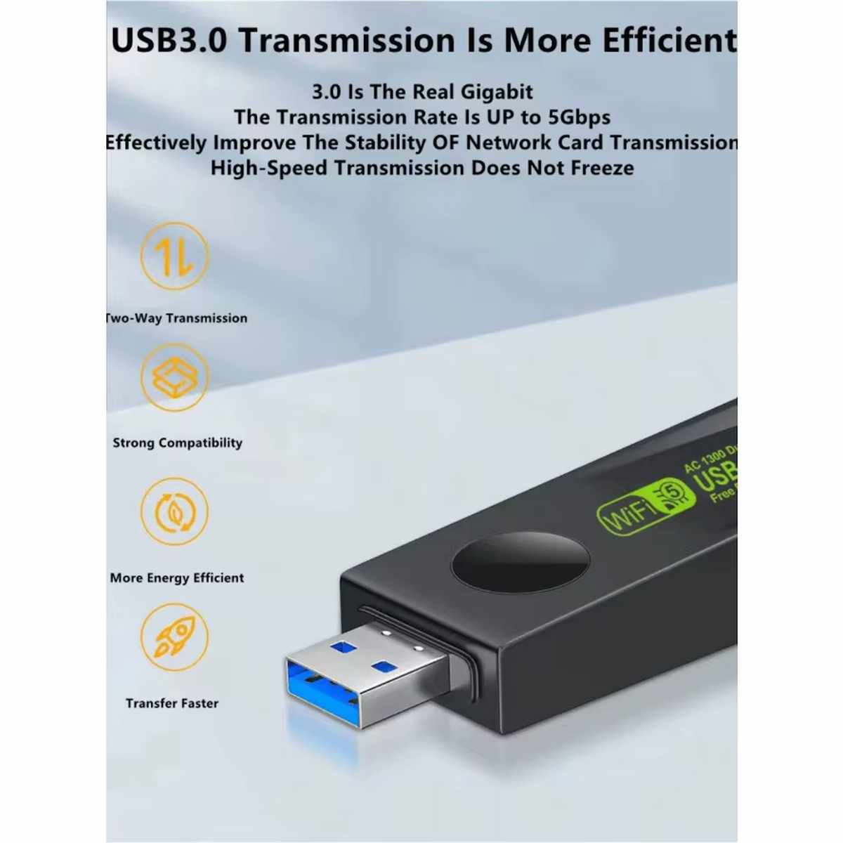 Ez a 1300 Mbps USB AC1300 Wi-Fi adapter egy dual-band vezeték nélküli hálózati interfész, amely 802.11ac (Wi-Fi 5) szabvány szerint működik. A dual-band működés lehetővé teszi a rádióforgalmat 2,4 GHz és 5 GHz sávokban egyaránt. A Wi-Fi 5 szabvány a 5 GHz sávon nagyobb sávszélességet és stabilabb kapcsolatot biztosít, mint a régebbi 802.11n eszközök 2,4 GHz-en.