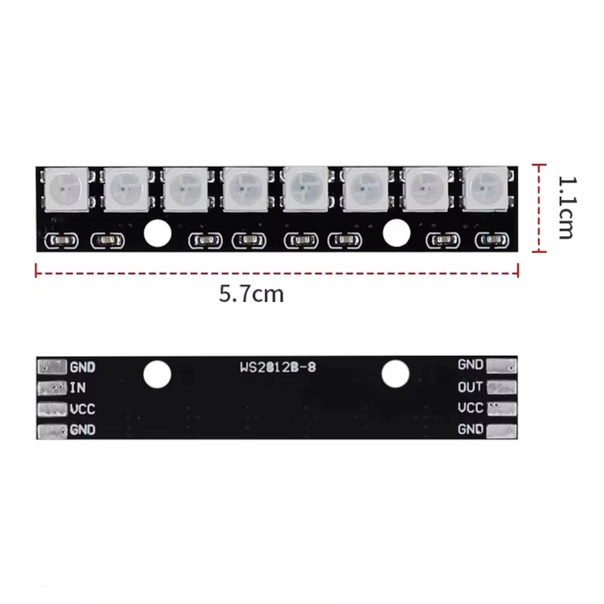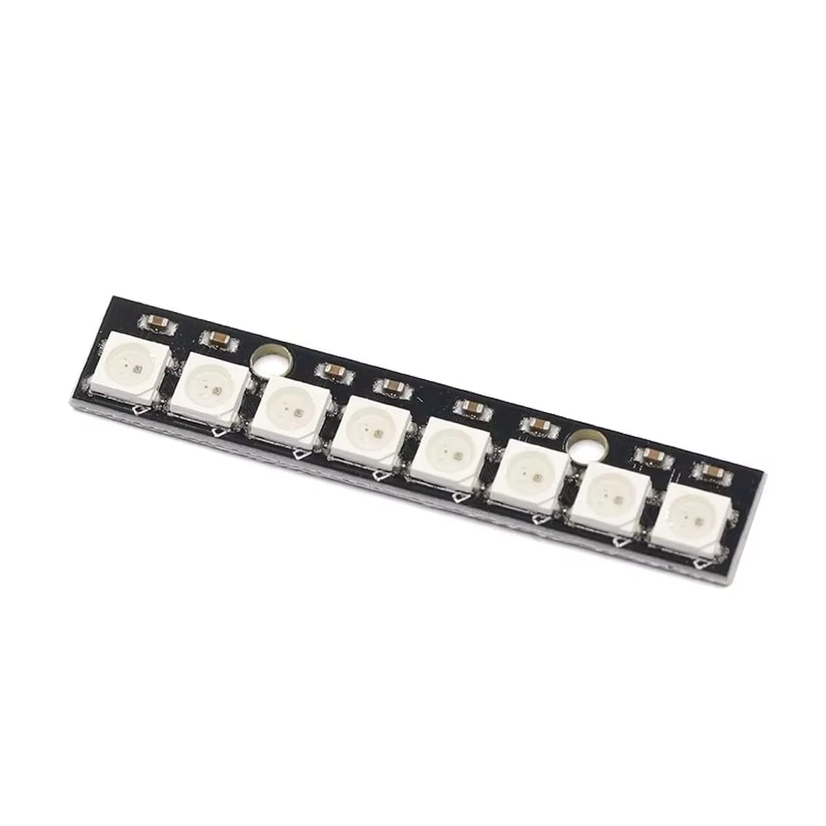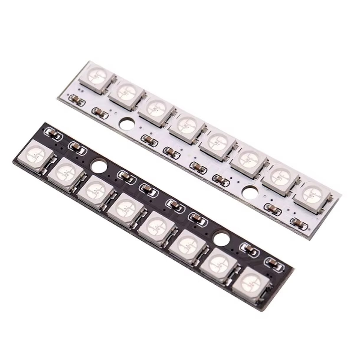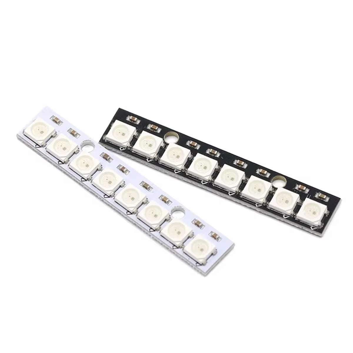 A kis RGB LED helyettesítő címezhető színes szalag – a modul 8 db, sorbafűzött WS2812B RGB LED pixelt tartalmaz. A LED-chip mérete az 5050 SMD RGB LED-del egyezik meg, ugyanakkor kezelése csak egyetlen processzor-kivezetést igényel. A kis vezérlő lábszám a LED tokozatba beépített vezérlőchipnek köszönhető. A táplálás a kontroller standard 5V rendszeréből történhet.