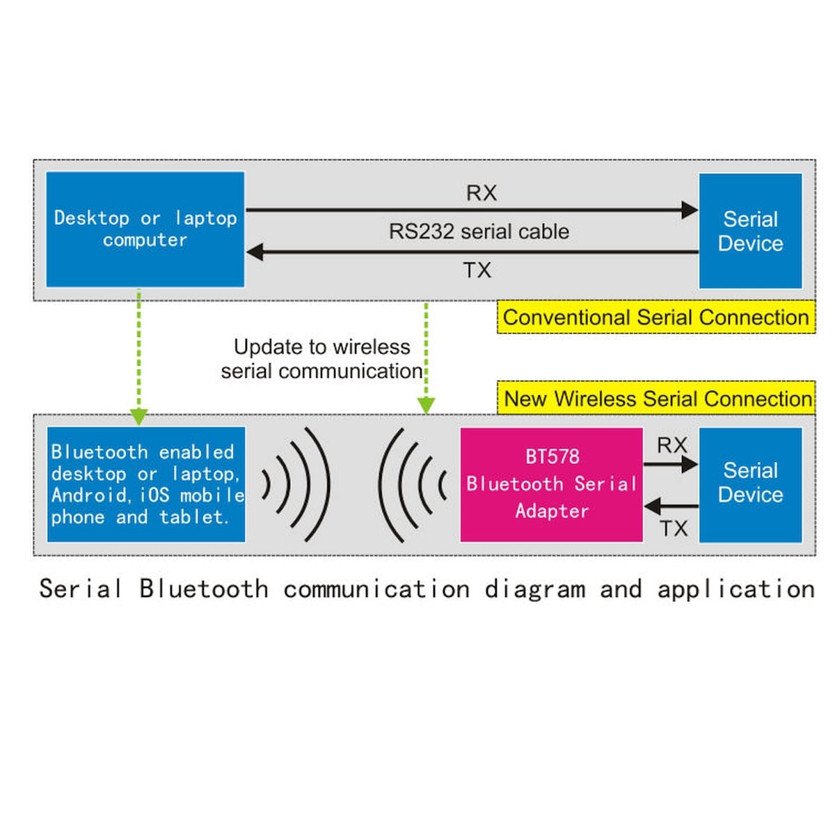 Van egy jól bevált, “régi vágású” RS232-es eszközöd, de eleged van a kábelekből? A BT578_V3 pont erre való: a DB9-es RS232 vonalat Bluetooth kapcsolattá alakítja, így a soros berendezésedet PC-ről vagy mobilról is eléred – vezeték nélkül.