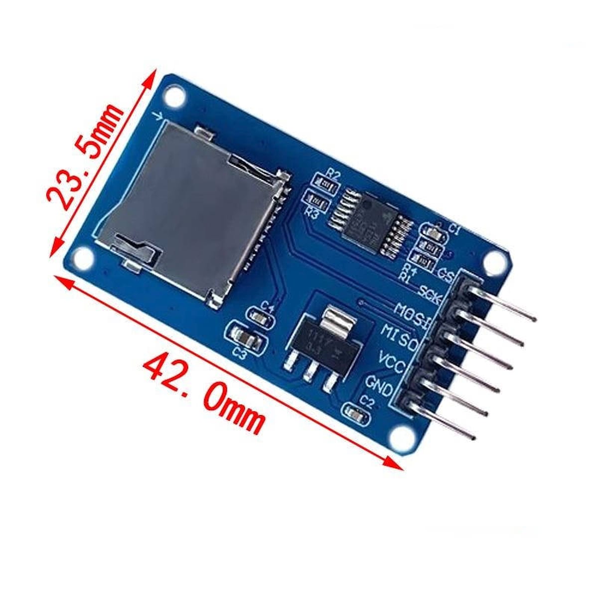 - található egy alacsony veszteségű (LDO) 3.3 V feszültségszabályozó – a bemeneti 5 V‑ról stabil 3.3 V‑ra alakítja a feszültséget, ami a microSD kártya számára biztonságos tápot biztosít.
