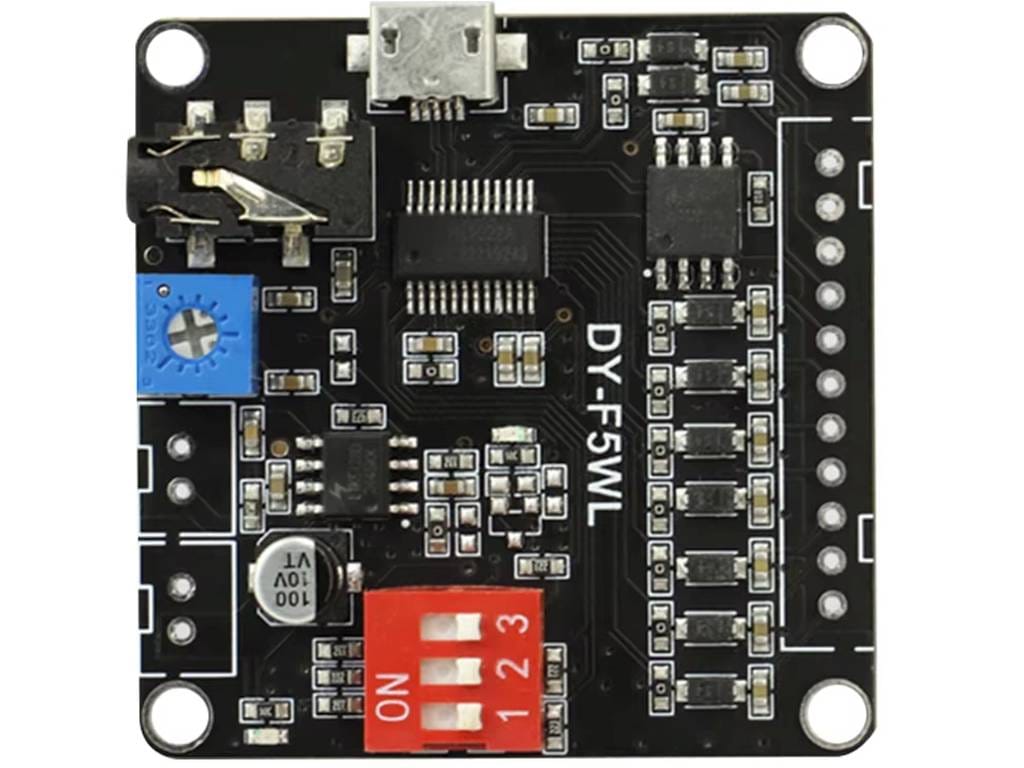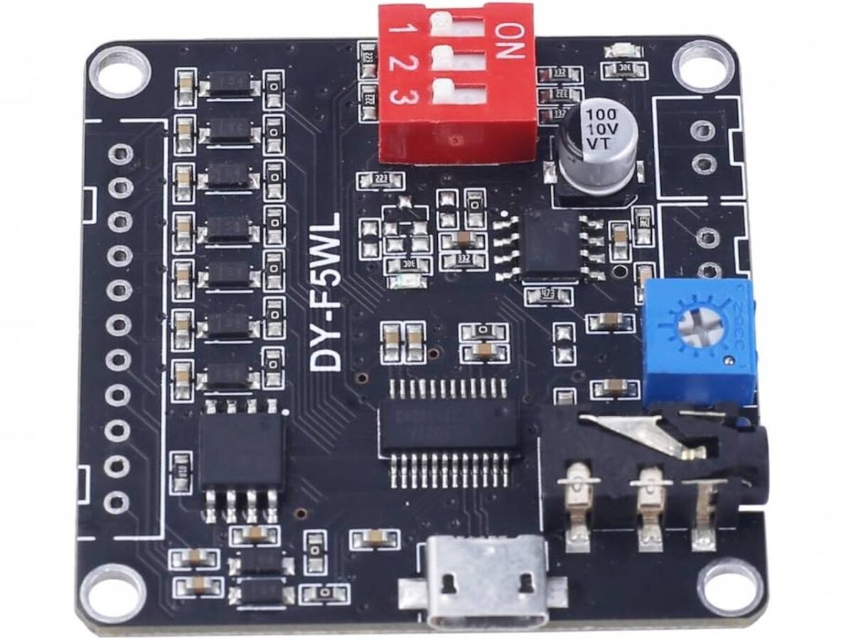 A DY‑F5WL egy teljes értékű 5 W‑os mono hang‑ és zenelejátszó modul, amely MP3 és WAV hangfájlokat képes lejátszani, és akár 9 külön vezérelhető triggerbemenettel működtethető. Ideális megoldás olyan automatizált, vezérléssel indítható hangos alkalmazásokhoz, ahol egyszerű, fizikai vagy mikrokontrolleres jelek hatására kell hangot lejátszani. A beépített Class‑D erősítő miatt külön külső erősítő nélkül is képes meghajtani hangszórót.