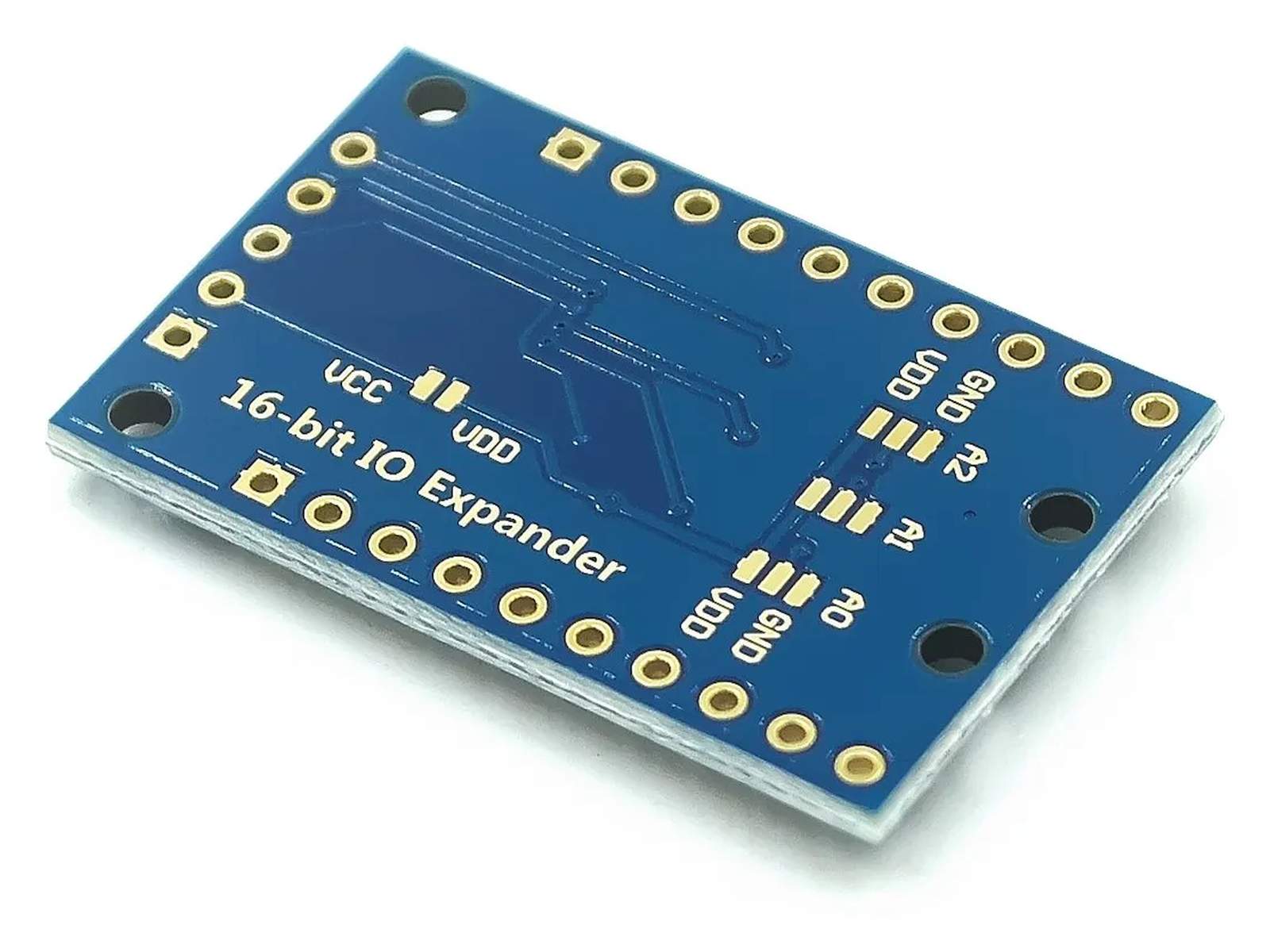 A modul három hardvercím-kiválasztó jumperrel rendelkezik (A0–A2), így egészen 8 darab expandert köthetsz egyetlen I²C buszra, maximálisan 128 portot megcélozva (8×16=128). A portkimenetek kvázi-bidirekcionálisak: felhúzó-ellenállásoss bemenetként vagy max. ~10 mA alacsony szintű kimenetként működnek – így közvetlen LED‑vezérléshez is alkalmasak.