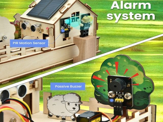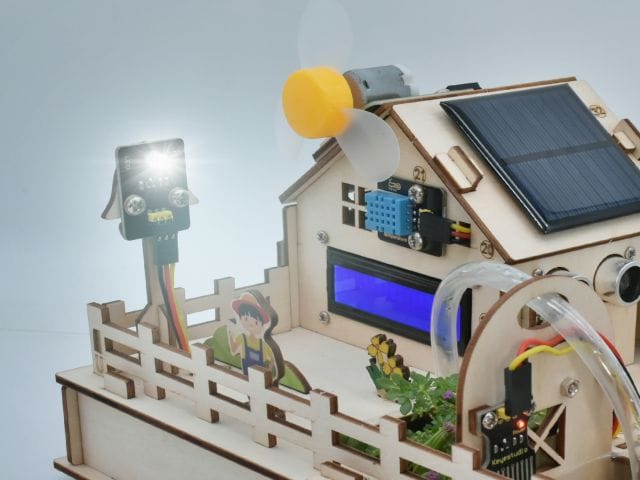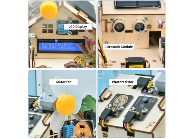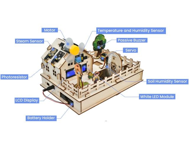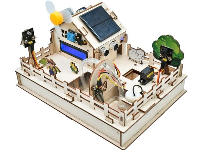 A talajnedvesség-érzékelő és a vízszintérzékelő segítségével automatizált öntözőrendszer hozható létre, míg a DHT11 hőmérséklet- és páratartalom-érzékelő a mikroklíma monitorozását teszi lehetővé. A fotoellenállás és a PIR mozgásérzékelő további adatokat szolgáltatnak a környezeti fényviszonyokról és a mozgásokról. A készlet tartalmaz egy LCD kijelzőt az adatok megjelenítésére, valamint egy 5V-os relémodult külső eszközök vezérléséhez. A szervómotor és a vízpumpa segítségével automatizált etető- és öntözőrendszerek építhetők. A napelem és a 6 db AA elem használatával a rendszer energiaellátása is biztosított.